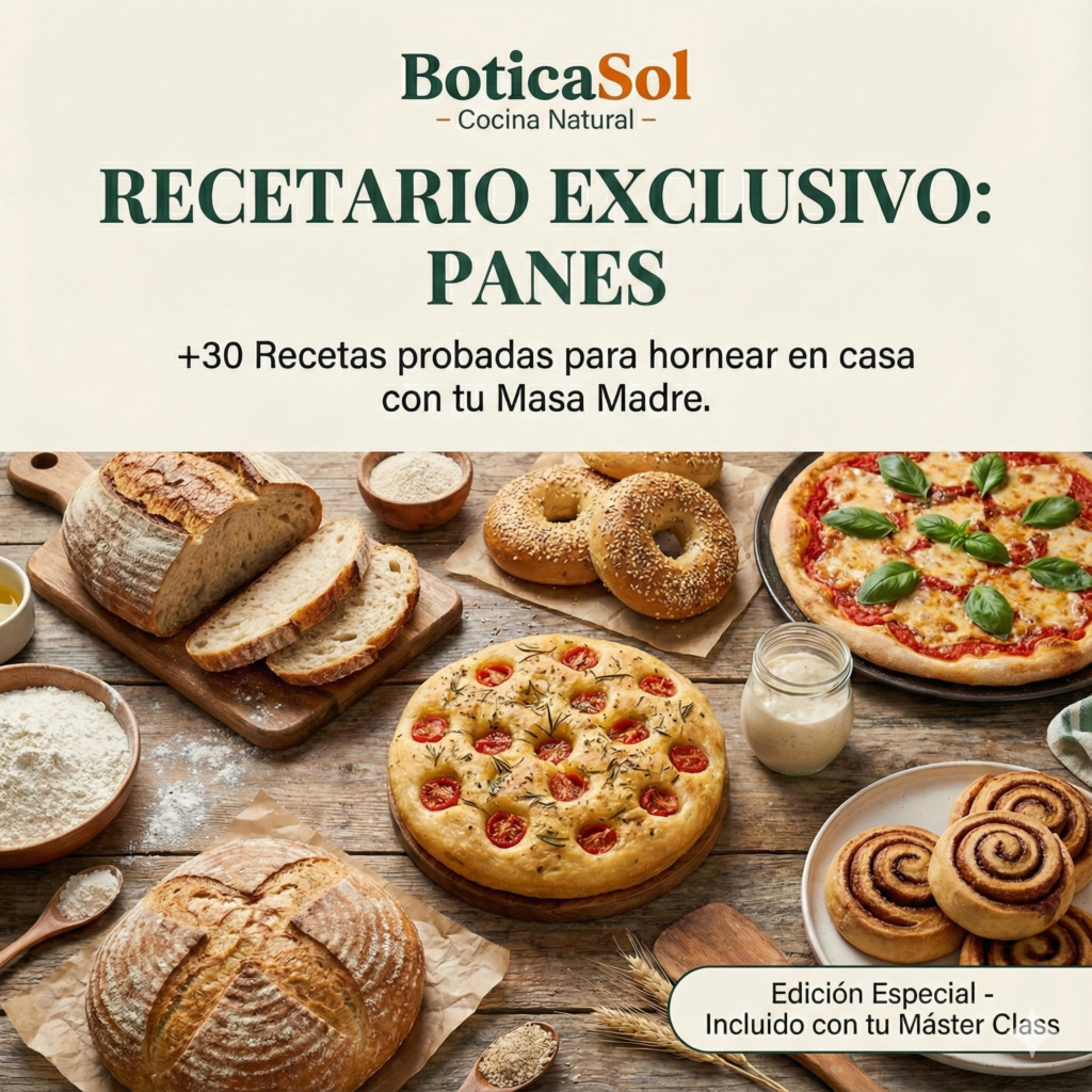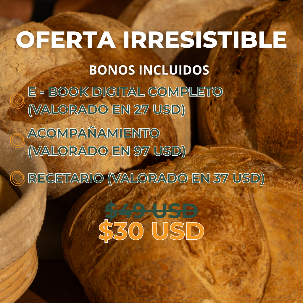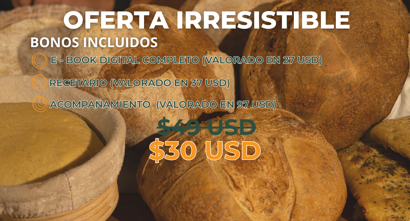 Más de 30 fórmulas probadas:Panes, Tipos de Harinas, Frutos Secos, Chocolate con Masa Madre. (Valorado en $37 USD) – ¡GRATIS!